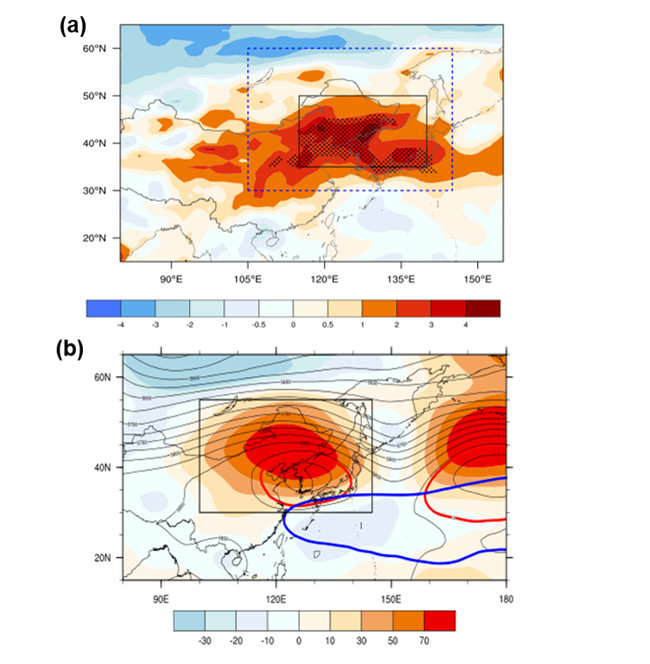 图1 2018年夏季,东北亚极端高温的观测特征。(a)平均温度异常,黑色打点为打破自1958年以来观测记录的格点;(b)500hPa位势高度异常(填色)、西太平洋副热带高压气候态(蓝色等值线)及2018年夏(红色等值线)位置。