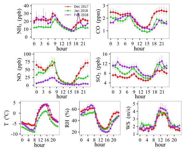 对2017/2018冬季高频测量数据统计后发现,香河大气氨浓度小时均值在0.8到483.3ppb之间,平均16.7±19.7ppb,远高于国内外其它站点冬季观测结果。冬季大气氨浓度的日变化存在明显早高峰现象(图2),推测其与早间露水蒸发有关。冬季不同月份之间氨气浓度的差异主要是由温度变化引起的,生物质燃烧也有一定的影响,而酸性前体物浓度的变化并不是氨气浓度月际差异的主要原因。