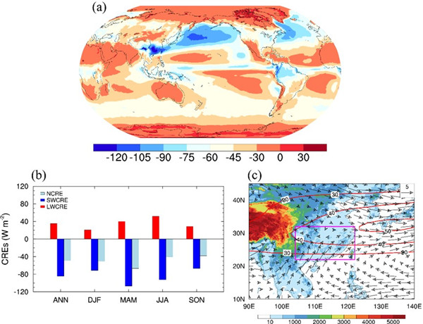 云强烈调控着大气的辐射能量收支,通过反射与散射太阳短波辐射对地-气系统起到辐射冷却作用。最新的卫星数据表明全球平均的云短波辐射冷却效应约为-46Wm-2,其中海洋边界层区和中纬度层云区的云对云辐射冷却效应有很大贡献。已有研究表明,中国东南部(包括西南、长江中下游和华南)分布有全球最强的云辐射冷却效应,春季的强度超过-120Wm-2,其形成和维持与同期青藏高原热动力强迫、低空西(南)气流汇合及高空西风急流抽吸有关(图1)。目前,云宏、微观物理属性的卫星反演资料还存在不确定性,气候模式模拟的云物理变量也有不小的偏差,而再分析的气象场具有相当的可靠程度。在此背景下,是否可以借助关键气象条件来研究区域云辐射效应的演变特征呢?事实上,当前云辐射效应及其与环流的关系研究是云辐射领域的热点和前沿内容,被“世界气候研究计划”及“国际云辐射反馈模式比较计划”列为关键科学问题之一。