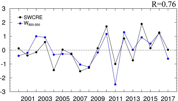 针对以上问题,中国科学院大气物理研究所LASG李剑东博士等人2019年基于CERES-EBAF卫星反演、ERA-Interim再分析资料及区域模式考察了中国东南部云短波辐射效应的维持机制,近期进一步考察了其年际变化特征。最新结果表明:2000年以来该区域春季云短波辐射效应呈现弱的增强趋势,在多数年其异常值也强于云长波暖化效应,意味着云辐射冷却主导着该区域云辐射效应的气候态及年际变化(图2)。此外,云短波辐射效应的年际变化明显不同于区域云粒子有效半径和气溶胶光学厚度,但与区域850-500hPa平均的垂直速度有很好的正相关,两者在2000-2017年的时间相关可以达到0.76,而且上升运动偏强(弱)年与云短波辐射效应偏强(弱)年完全对应(图3)。这表明该区域云辐射冷却效应的年际变化主要受环流条件影响。