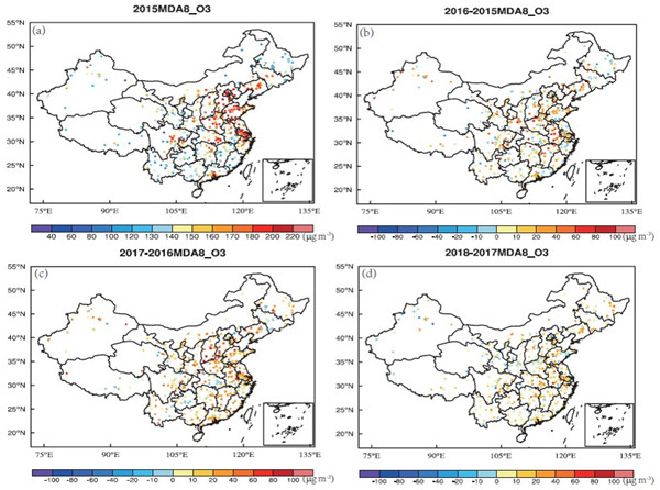 图:基于2015-2018年中国生态环境部1484个监测站点的日最大8小时臭氧浓度的90百分位数分别在(a)2015年的浓度值和(b)2015-2016年,(c)2016-2017年,(d)2017-2018年间的浓度差值。