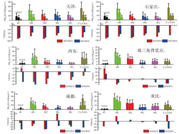 (2)秋冬季重污染期间,颗粒物中硫酸盐(SO42-)和有机物(OM)质量浓度下降明显。京津冀、珠三角、成渝和汾渭平原地区PM2.5中SO42-浓度分别下降了76%、12%、81%和38%;OM分别下降70%、44%、48%和31%; 铵盐(NH4+)分别下降68%、1.6%、38%和25%。EC在京津冀和成渝分别下降84%和20%,但在珠三角和汾渭平原地区分别上升61%和11%。