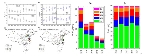 图2 2013-2017我国大气PM2.5浓度的显著降低(左图a, c)和地面臭氧浓度的升高(左图b, d);2013-2017年北京大气PM1细颗粒物化学成分浓度以及比例变化(右图:a浓度变化,b成分比例)
