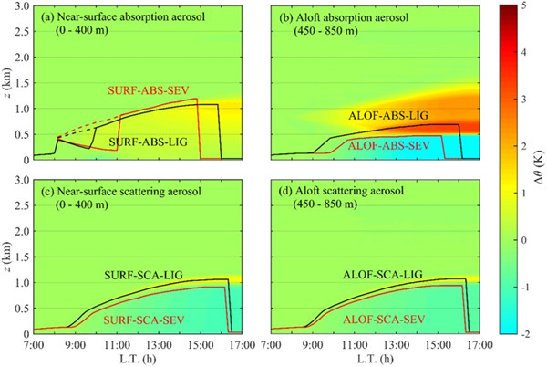 图1. 不同高度气溶胶层作用下边界层高度日变化特征,(a)近地面吸收型气溶胶,(b)空中吸收型气溶胶,(c)近地面散射型气溶胶,(d)空中散射型气溶胶。(a)-(d)黑色实线为低浓度气溶胶(AOD = 0.5)实验,红色实线为高浓度气溶胶(AOD = 1.5)实验。背景为高浓度与低浓度实验的位温差Δθ = θSEV - θLIG。图(a)中虚线为太阳短波辐射吸收加热导致残留层发展。