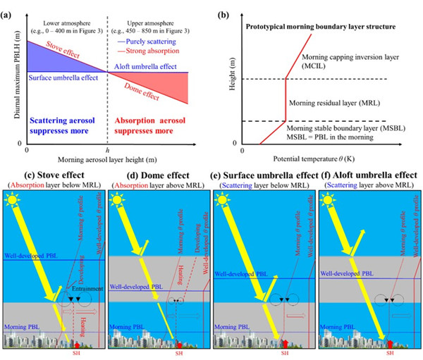 图2.(a)气溶胶光学特性(吸收、散射),初始气溶胶层高度与边界层日最大高度关系图;(b)典型早晨边界层温度层结结构,近地面稳定边界层(MSBL),残留层(MRL)和顶盖逆温层(MCIL)。(c)-(f)为气溶胶“火炉”,“穹顶”,地面和天空“阳伞”效应概念图。SH为感热通量,PBL为边界层高度。
