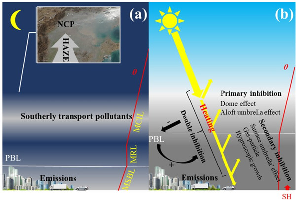 图3. 华北平原雾霾形成机制概念图。(a)为南风传输污染物累积在华北平原上空;(b)气溶胶吸收散射太阳辐射,基于“穹顶”和“阳伞”效应对边界层产生双重抑制效果,促进污染累积爆发。