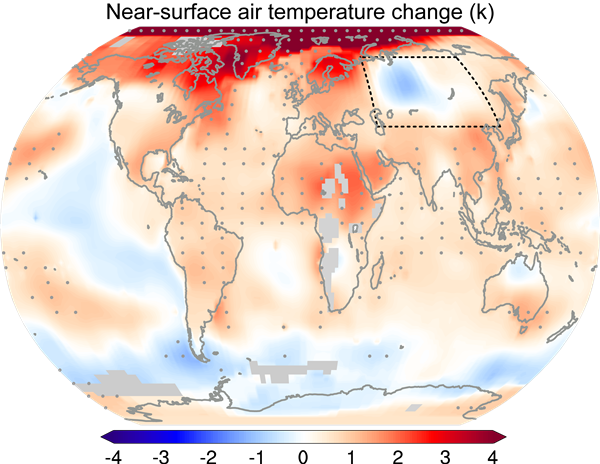图1. 冬季近地面气温在1979-2017年间的线性变化趋势(单位:K)。结果基于GISTEMP气温观测数据。灰色圆点表示线性趋势通过了99%置信度水平的显著性检验.(原文中Figure 1a)