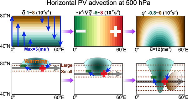 中国科学院大气物理研究所近期发表于Journal of Climate的研究工作发现,冬季纬向非均匀的北极增暖能够通过局地的位涡制造以及向中高纬地区的位涡平流,对欧亚大陆冬季气候变化产生影响。