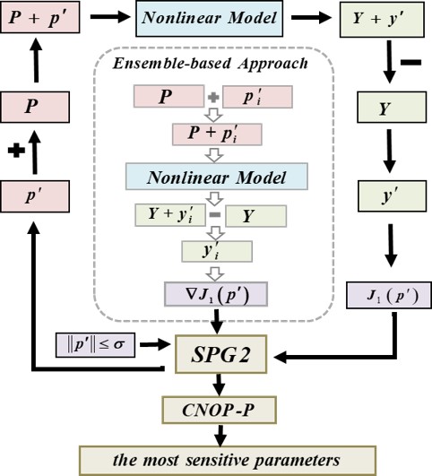 图1 使用集合投影方法求解CNOP-P的流程示意图