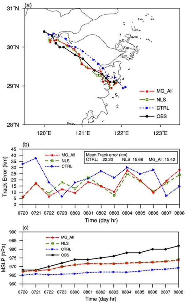 大气所张璐、田向军等人以台风海葵(2012)为例(图1),采用无需切线性和伴随模式的集合变分混合同化方法——多重网格NLS-4Dvar方法同化了多普勒雷达资料,对该台风的结构及路径、降水预报进行了分析和讨论。研究表明,同化雷达资料后,台风强度与实际观测更接近,完成对台风结构的调整和改进后,台风12小时路径预报(图2)和12小时累积降水预报精度都有明显提高,且同化方法中多重网格策略的引入也使得同化过程更高效。