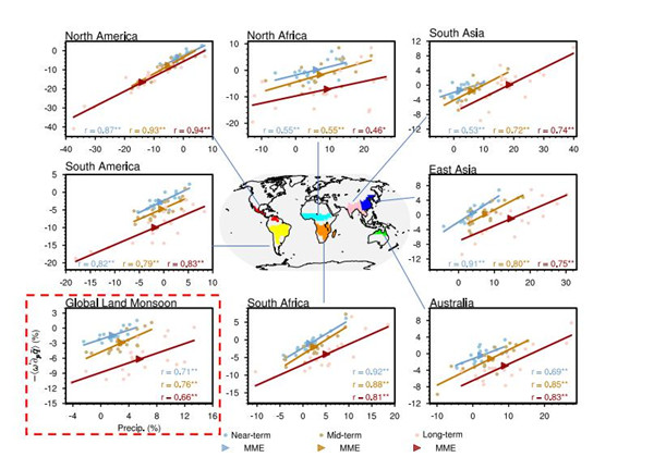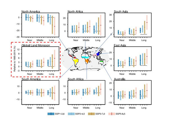 近日,中国科学院大气物理研究所的博士生陈梓明在其导师指导下,基于第六次国际耦合模式比较计划(CMIP6),四种未来预估情景的试验(SSP1-2.6、SSP2-4.5、SSP3-7.0和SSP5-8.5),探究了21世纪全球陆地季风区的夏季降水变化特征及模式间不确定性的来源。