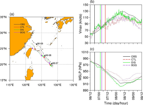 最近,中科院大气物理研究所陈光华研究员团队的施东雷博士研究生基于2019年超强台风“利奇马”快速增强(RI)阶段的数值模拟,对比了两类主要的初始化方案(动力初始化方案和Bogus方案)对TC强度预报的影响。其中,动力初始化(DI)方案通过6小时的模式循环积分逐步调整TC的强度及结构,而Bogus方案是利用一个人造的Rankine涡旋直接替换初始涡旋,使初始TC达到观测强度。研究设置三组试验,控制试验(CTL)不使用任何初始化方案,另外两组试验(DIS和BOG)分别使用DI和Bogus方案对初始涡旋进行调整。如图1所示,虽然两类方案都在一定程度上改善了强度预报的结果,但相对来说DIS能更好地再现了“利奇马”的RI过程,而Bogus试验中TC的RI启动较晚,且在RI后期强度偏弱。