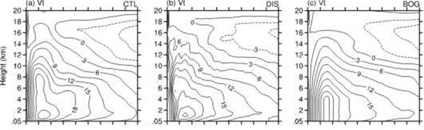 图2. 三组试验中初始时刻TC轴平均切向风随半径-高度的分布图。CTL为控制试验,DIS为使用DI方案的试验,BOG为使用Bogus方案的试验。