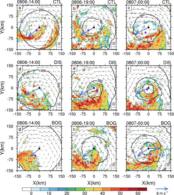 图3. 三组试验中的海平面气压(等值线,hPa),雷达反射率(阴影,dBZ),和8-km高度的风场(箭头)。图中蓝色箭头代表300-850 hPa的垂直风切,黑色和紫色台风标志分别代表低层和中层涡旋中心。