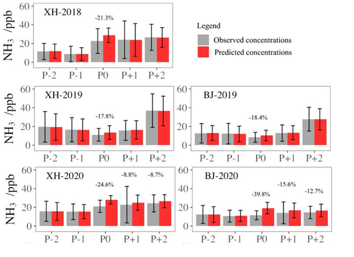 图2 春节及疫情前后氨气浓度预测值与观测值(P0为春节假期,柱间隔为2周)