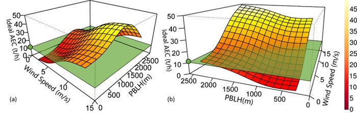图2.污染环流(a)和清洁环流(b)背景下行星边界层高度和水平风速拟合的理想大气环境容量;绿色平面为国家标准中经验系数A计算的大气环境容量。