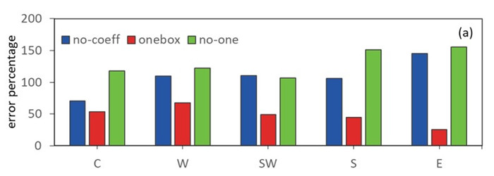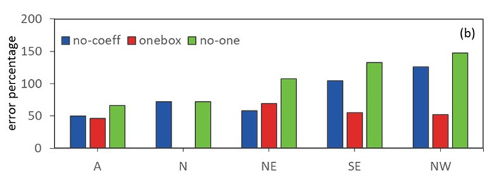 图3. 污染环流型(a)与清洁环流型(b)背景下改进算法的AEC与无时间系数AEC (no-coeff)、单箱模型AEC (onebox)和传统A值法AEC (no-one)的相对误差;清洁型环流包括反气旋型(A)、北风型(N)、东北风型(NE)、东南风型(SE)与西北风型(NW);污染型环流包括气旋型(C)、西风型(W)、西南风型(SW)、南风型(S)与东风型(E)。