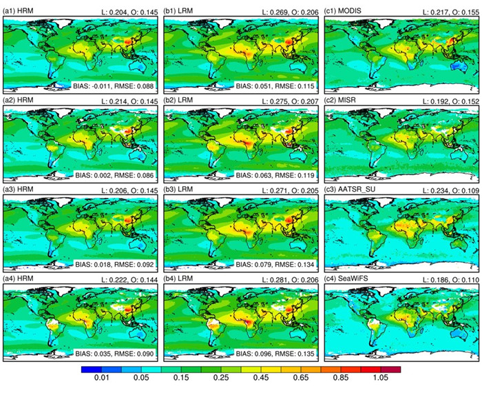 图1 高低分辨率模式模拟和卫星观测的年平均气溶胶光学厚度空间分布的对比。a1-a4和b1-b4分别代表高分辨率模式和低分辨率模式模拟结果。c1-c4代表MODIS、MISR、AATSR_SU和SeaWiFS卫星反演结果。