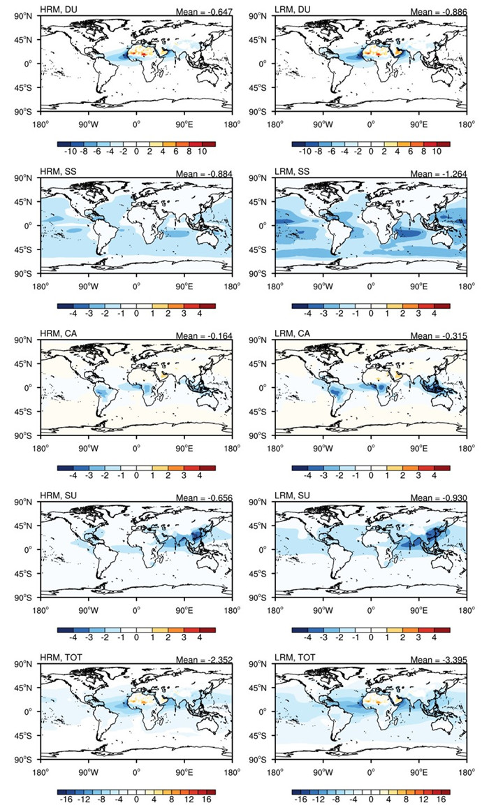 图2 高低分辨率模式模拟的大气顶沙尘、海盐、碳类和硫酸盐及总气溶胶直接辐射效应的空间分布。