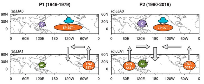 机制分析表明,1970年代末以来,前一年夏季太平洋异常暖海温由东太平洋西移至中太平洋,后一年夏季北印度洋显著增暖,且北大西洋暖海温也有所增强。以上热带海温的年代际调整与1970年代末ENSO性质的年代际转变密切相关,共同导致了关键系统西北太平洋环流异常的增强。本研究强调了近年来洋际相互作用对东亚夏季风的重要影响,也深入了对ENSO变异调制东亚夏季风的理解。