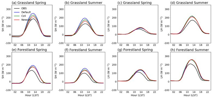 图1观测和模拟的感热通量(SH)和潜热通量(LH)的日内变化。OBS表示ChinaFLUX观测值,Default、Czil和Newczil分别表示WRF/Noah-MP模式默认M-O、Czil=0.1和Czil-h方案。(a–d)表示五个ChinaFLUX草地站点(Dan、Sw2、Cng、HaM和 Du2)的平均值;(e–h)表示三个森林站点(Qia、Din和 Cha) 的平均值