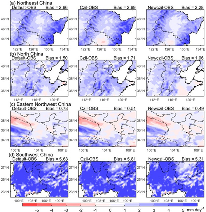 图2 2003~2012年夏季(a)东北、(b)华北、(c)西北东部和(d)西南地区观测和模拟的降水差值的空间分布。OBS表示中国气象局站点观测值,Default、Czil和Newczil分别表示WRF/Noah-MP模式默认M-O、Czil = 0.1和Czil-h方案。Bias表示模拟和观测值的区域平均偏差