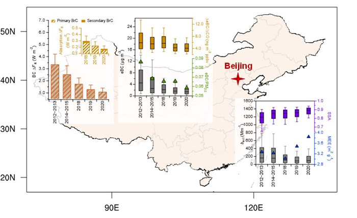 黑碳作为主要的吸收气溶胶,会对大气产生正的辐射强迫,显著影响地-气系统的辐射平衡。过去十年,北京通过实施清洁空气行动计划显著降低了PM2.5浓度,在此背景下探究黑碳及气溶胶光学特性的响应对进一步改善空气质量提高大气能见度具有积极意义。由此,LAPC国家重点实验室孙佳星博士和孙业乐研究员等从2012年到2020年在大气所铁塔分部对当量黑碳质量浓度(eBC)和大气消光系数进行了长期观测,分析了黑碳、气溶胶光学特性、棕碳(BrC)吸收系数及波长吸收指数(AAE)等变化,量化了一次排放和二次形成对BrC吸收的贡献,评估了BC和BrC的变化对大气直接辐射效应的影响。