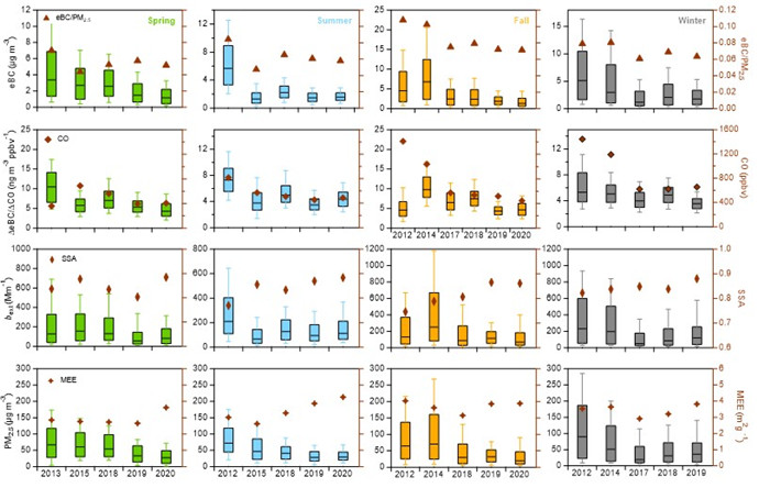 图2. eBC、eBC/PM2.5、△eBC/△CO、CO、bext、SSA、PM2.5和MEE的季节变化。