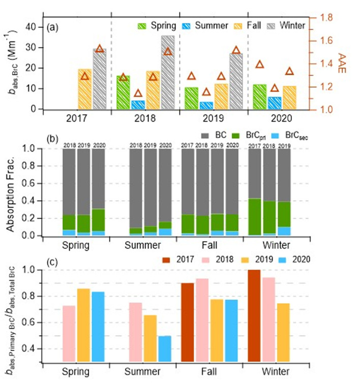 图3. 2018年至2020年(a)babs, BrC、AAE的季节变化,(b)吸收组分对吸收系数的贡献,以及(c)babs、secondary BrC在370nm处BrC吸收中的占比。