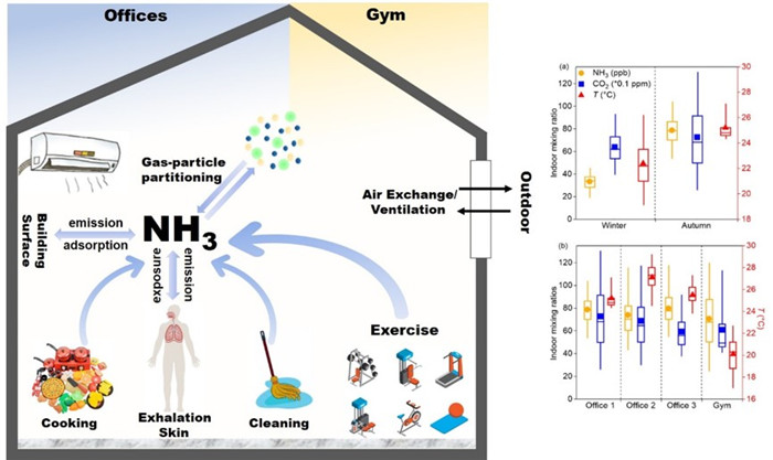 NH3是大气中最重要的碱性气体,其在室内环境中的浓度往往显著高于室外,而高浓度的NH3不仅对人体健康造成一定影响,也会贡献室外大气中的NH3浓度,但目前室内NH3的浓度、变化及其来源仍不清晰。为此,LAPC国家重点实验室李峻瑶博士和孙业乐研究员在3个不同学生办公室和1个地下健身房开展了室内NH3的观测与分析,同时进行了开关窗、烹饪、清洁等控制实验研究了室内NH3的源、汇及人类活动影响下NH3的动态变化过程(图1)。