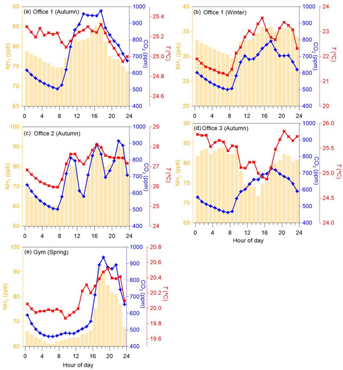 研究发现,不同季节、不同室内环境中NH3和CO2浓度的日变化规律相似,且与人的活动规律一致(图2)。人的皮肤裸露程度、室内温度、房屋建筑材料和人类活动(人数变化、开关窗、做饭、清洁、运动)都会显著影响室内NH3的浓度水平。夏季皮肤暴露更多,排汗增多,会导致表皮向室内空气中排放的NH3增加;室内温度升高会加速NH3从表面储库和建筑材料的释放;新装修的房间虽然只有一个人,但是由于装修材料的NH3排放,其室内平均NH3浓度却是几个环境中最高的;炒蔬菜几乎不排放NH3,而含动物蛋白食物的烹饪对室内NH3浓度有很大的贡献,这是高温下肉类蛋白质中氨基酸的热解导致的;学生集中运动时,健身房中NH3的瞬时浓度会达到很高的值,表明人的排放与呼吸、排汗等新陈代谢速率有关。