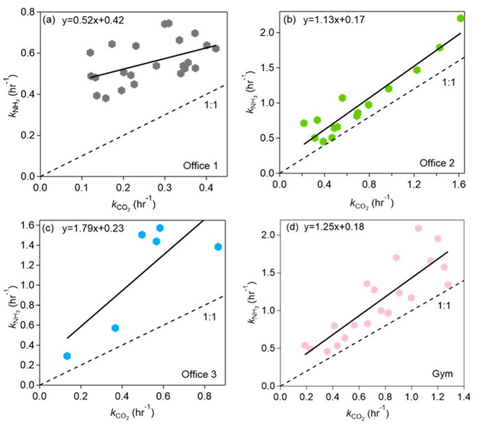 图3. 不同室内环境中NH3去除速率与CO2衰减速率之间的相关性