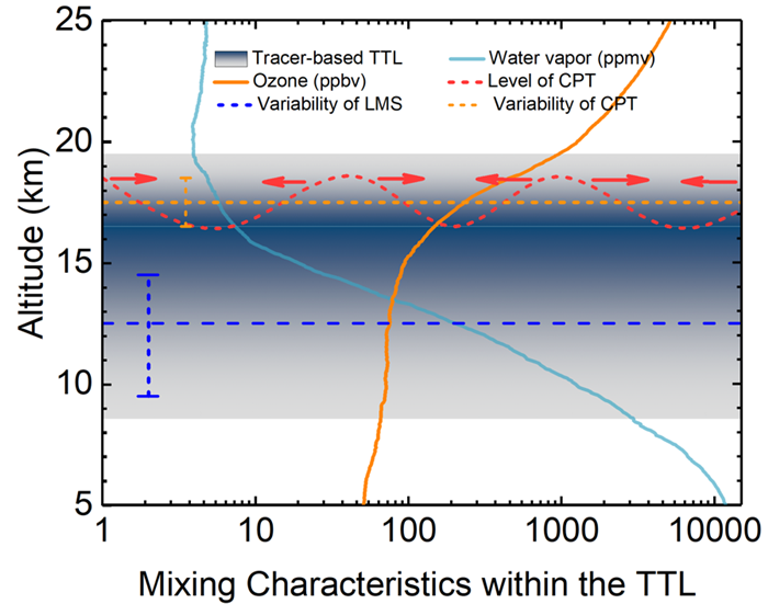 热带对流层顶是水汽和短寿命的物质进入平流层的窗口,在对流层和平流层之间的耦合中发挥着重要作用。关于对流层顶的研究已有多年的研究基础,近年来,热带对流层顶被认为是对流层和平流层之间具有几公里厚度的过渡带,而不是一个尖锐的分界面,被称为热带对流层顶过渡层 (TTL) 。TTL的一种定义是以大气的热力结构来确定的(thermally-based TTL),即以大气中最不稳定的高度(LMS)为下边界,最冷点的高度(CPT)为其上边界。其中,LMS通常对应于深对流出流的最高高度;CPT对应于大气中最冷点的高度,其对于进入到平流层的水汽浓度具有重要意义。另一种定义TTL的方法是基于示踪物相关关系方法。基于热力学定义的TTL将对流层顶定义为热力转换区,但不考虑平流层与对流层之间的气团混合特征。而利用示踪物相关关系可以识别所有的混合气团,无论混合气团是否来自于thermally-based TTL,还是LMS以下或CPT以上,这也是对流层顶层的一个基本特征。亚洲夏季风区是低层大气成分进入平流层的重要输送通道。人类活动产生的污染物通过此通大道侵入大气上部,对平流层大气成分及其气候效应产生重要影响。开展夏季亚洲季风区大气成分垂直结构以及对流层顶相关研究,对于揭示影响大气成分时空变化的机理,定量评估人类活动对大气成分的影响及其气候环境效应具有重要意义,也为预测区域乃至全球未来气候环境变化提供科学依据。