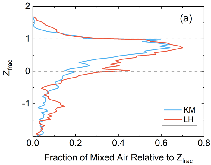 图3 昆明和拉萨对流层顶转换层气团的混合特征。Zfrac=0表示LMS的高度,Zfrac=1表示CPT的高度。本研究表明在LMS以下,CPT以上2km的高度都观测到混合气团特征。