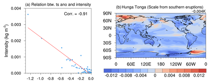 图 (a) CESM过去千年模拟试验中火山爆发后次年地表温度异常与火山爆发强度之间的关系。(b) 基于气候模拟试验中南半球火山爆发后全球地表温度异常估算的汤加火山爆发对全球地表温度的影响。