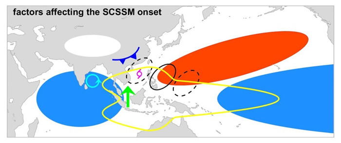 图1. 影响南海夏季风爆发异常的重要因子:厄尔尼诺-南方涛动(蓝色)、太平洋年代际振荡(红色)、印度洋海盆一致模(蓝色)、青藏高原积雪(白色)、越赤道气流(绿色箭头)、MJO和/或30-60天振荡(黄线)、准双周振荡(黑线)、热带气旋(洋红)、冷锋(蓝线)、孟加拉湾季风爆发涡旋(青线)