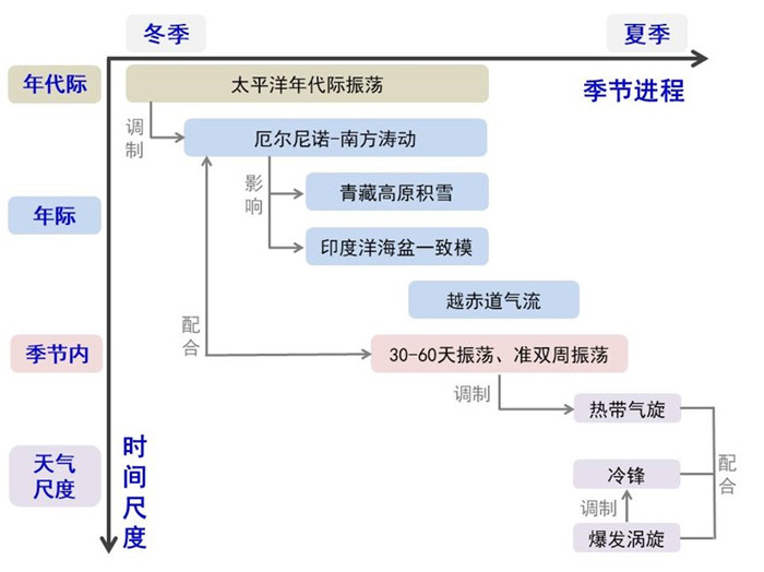 图2. 影响南海夏季风爆发异常重要因子之间的关联示意图。横坐标是自冬季到夏季的季节进程,纵坐标是自年代际到天气尺度的时间尺度