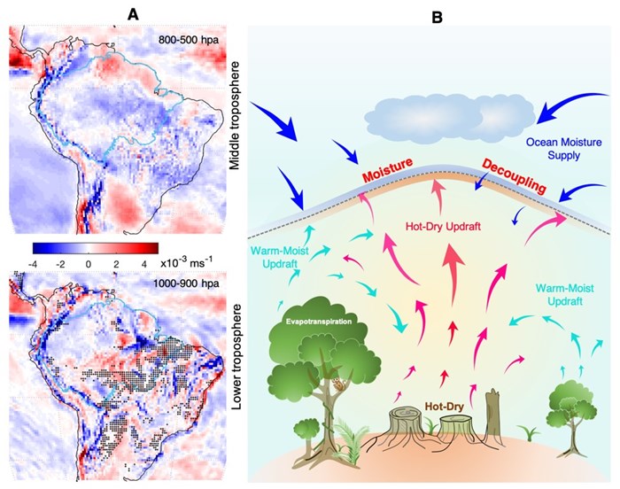 图 1.(A) 2000-2019 年相对于 1980-1999 年对流层中层(800-500 hpa)和对流层低层(1000-900 hpa)的旱季上升气流变化; (B) 毁林引起的暖干上升气流抑制了热带大西洋向亚马逊的水汽输送示意图。