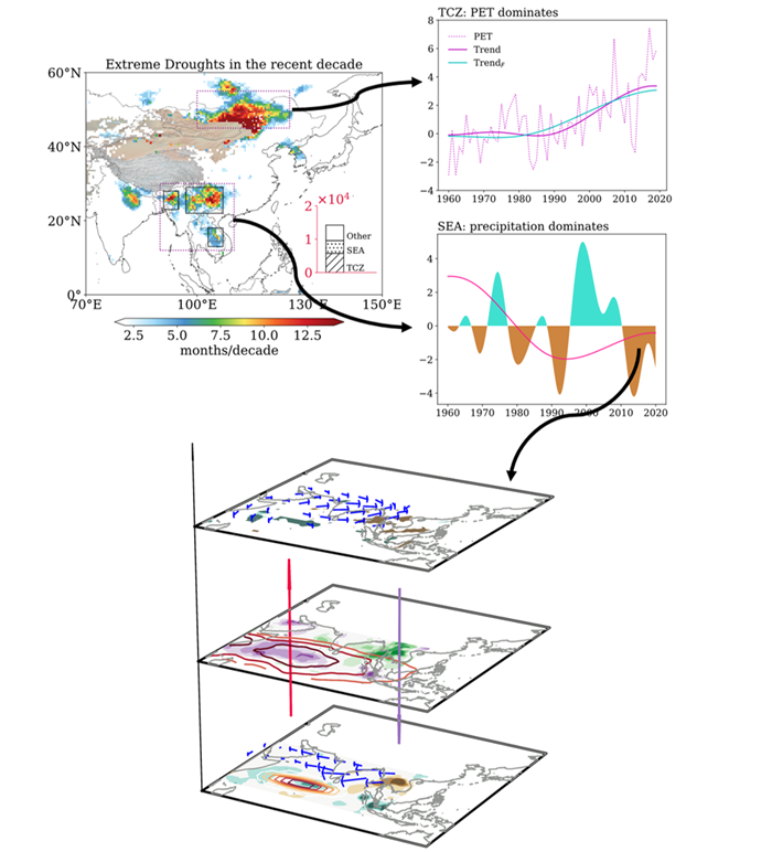 最近十几年,东亚超级干旱发生的频率在最近10年显著增强,主要包含两个热点区域:过渡带地区(TCZ)和亚洲东南部地区(SEA)。2010-2019年,TCZ发生的超级干旱总月份数占整个区域的40%,SEA发生的超级干旱占27%。这两个热点区域的总贡献达到2/3,对于过渡带地区,2000年之后是超级干旱频发时段,夏季最多,冬季几乎很少发生。对于亚洲东南部地区,1990年前后和近十几年为超级干旱频发的时段,夏季和秋季和最易发生。基于统计和模式归因分析,过渡带(TCZ)的超级干旱增加主要由全球变暖导致的蒸发增加驱动的,蒸发增加的贡献可达80%,对于蒸发而言,内部变率作用相对较弱,主要是外强迫的贡献,全球变暖趋势信号可以解释局地蒸发变化的90%。亚洲东南部地区(SEA)最近十几年的超级干旱频发主要是降水的贡献,贡献率60%–80%。对于降水变率而言,主要是年代际自然变率的贡献,而外强迫的贡献只有自然变率的15%。