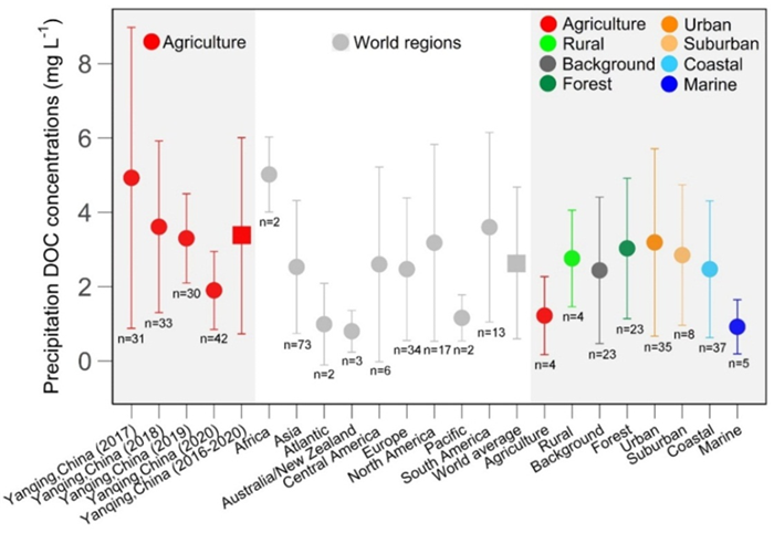 图1. 北京郊区降水有机碳浓度与全球其它地区测量结果的对比