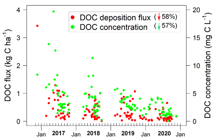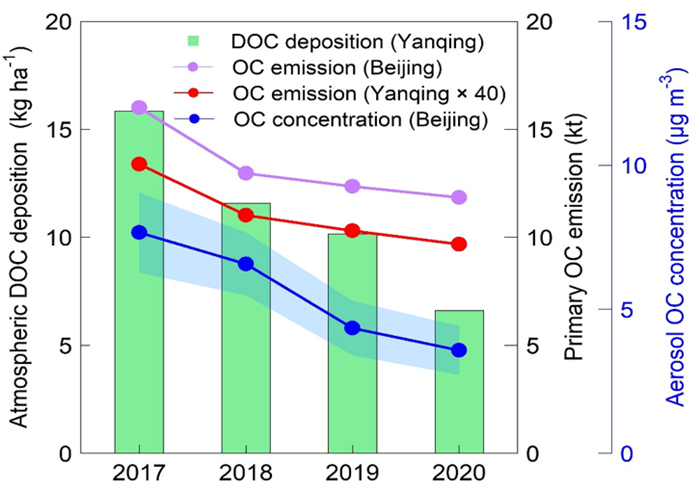中国科学院大气物理研究所是亚洲较早开展大气降水DOC沉降研究的单位。2007-2008年的观测结果显示,DOC是华北降水OC的主要成分(颗粒态OC占比仅21%),其沉降量(19 kg C ha-1 yr-1)处于全球测量范围(12-28 kg C ha-1 yr-1)的中间位置。过去十年,随着我国大气污染防治行动计划的实施,OC排放量迅速下降,降水DOC沉降如何响应OC排放的变化尚不清楚。