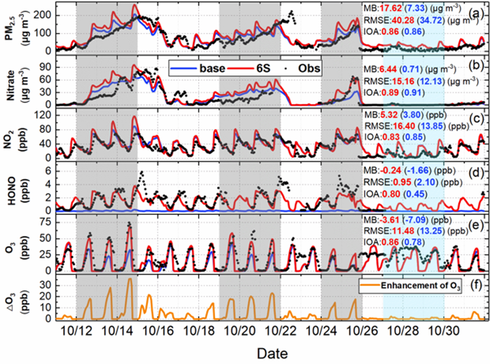 图1. 2018年秋季北京城区污染物观测与模拟对比(红线: 加入6种HONO潜在来源模拟(6S); 蓝线: 默认HONO机制的模拟(base); 灰色时段: 空气污染加重过程; 淡蓝色时段: 典型清洁天)