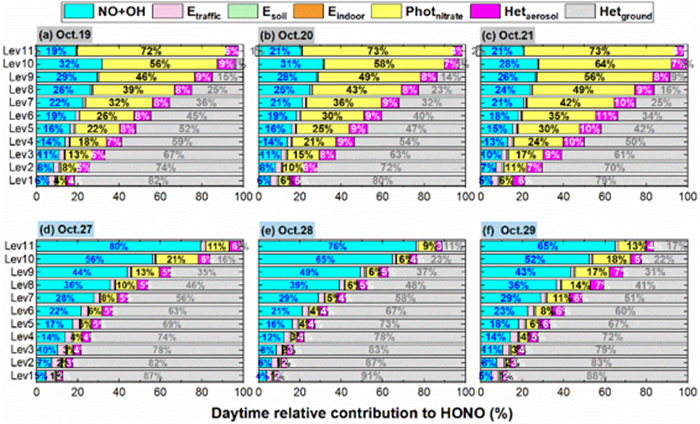 图2. 典型污染加重过程(10月19–21日)及典型清洁天(10月27–29日)华北平原95个监测站点各HONO潜在来源对HONO垂直浓度的相对贡献