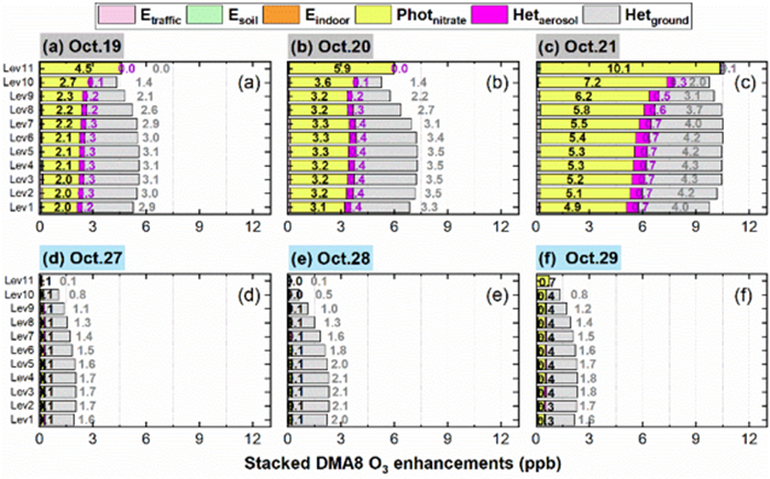 图3. 典型污染加重过程(10月19–21日)及清洁天(10月27–29日)华北平原95个监测站点6种HONO潜在来源对垂直方向日最大8小时O3浓度增量的贡献。