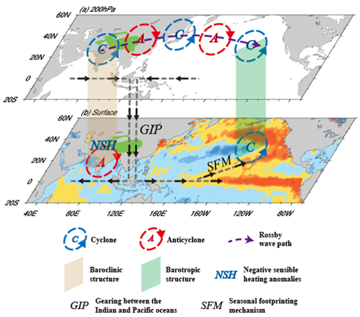 “负感热-斜压模”在五月份达到最强,它通过两种途径诱发赤道西太平洋低层西风异常,进而导致随后秋冬季厄尔尼诺事件的发生。第一种途径:“负感热-斜压模”引起赤道印度洋高层西风异常以及低层东北风异常,使得印度夏季风减弱、海洋性大陆出现下沉运动,通过印度洋纬向季风环流和太平洋沃克环流的齿轮耦合(gearing between the Indian and Pacific oceans,GIP,吴国雄和孟文(1998)),诱发了赤道西太平洋低层西风异常。第二种途径:“负感热-斜压模”能够激发向下游传播的Rossby波列,导致北太平洋中部呈相当正压的气旋式环流异常。基于风-蒸发-海温反馈机制和季节足迹机制(seasonal footprinting mechanism,SFM),该气旋式环流异常东南侧的副热带地区出现暖海温异常,并导致副热带至赤道中西太平洋地区低层西南风异常的出现。由GIP和SFM共同引起的赤道西太平洋低层西风异常,通过Bjerknes正反馈,进一步导致随后秋冬季厄尔尼诺事件的发生。此外,春季高原表面风速偶极子模态负位相有利于随后秋冬季拉尼娜事件的发生。