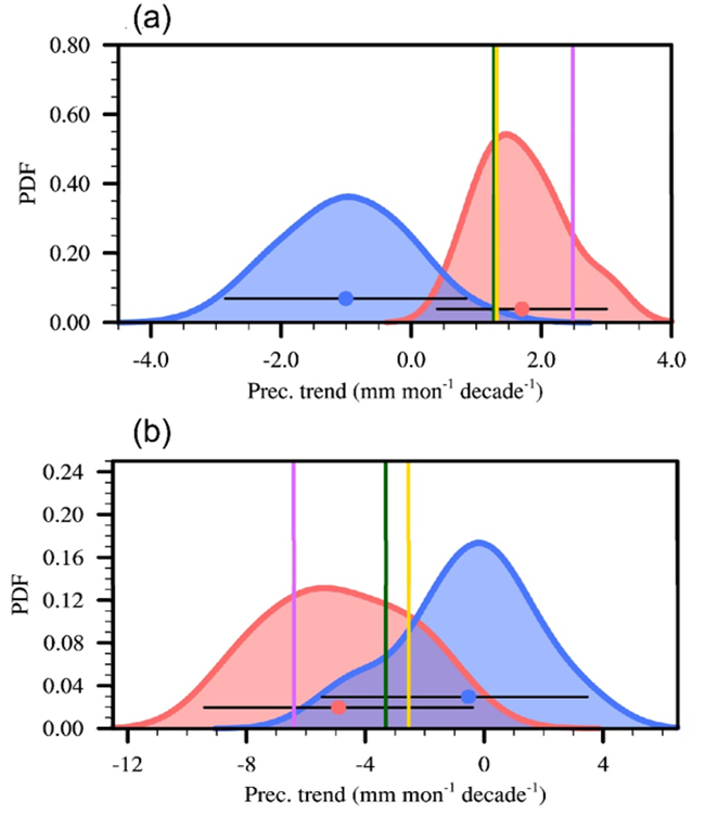 图1 观测和有无人为强迫影响试验模拟的(a)高原北部和(b)高原南部降水趋势(单位:mm month-1 decade-1),其中粉色阴影为包含人为强迫的大样本全强迫试验模拟的降水趋势概率密度函数,蓝色阴影同粉色,但为不包括人为强迫的大样本自然强迫试验结果。圆点表示每个试验的集合平均值。黑色横线表示相应分布的5%-95%的范围。绿色、黄色和紫色线分别表示CRU、GPCC和JRA55降水趋势。