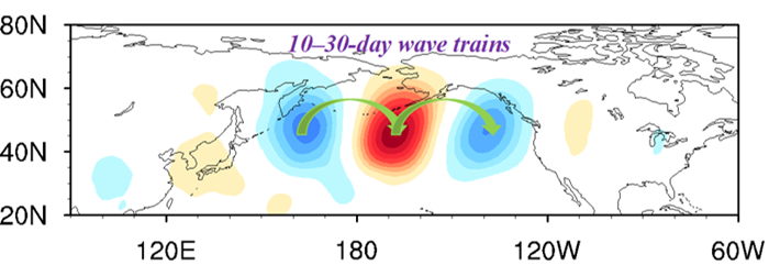 中国科学院大气物理研究所LASG国家重点实验室博士研究生杜雷和陆日宇研究员在2021年的工作中发现了一个横跨北太平洋地区的波列 (Du and Lu, 2021)。该波列连接了东亚和北美地区,其主导尺度为10-30天,纬向分布于上层西风急流带中,主要通过斜压能量转换从背景流中获取能量得到发展和维持。