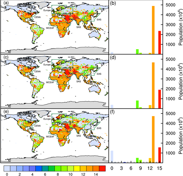 图2. 全球温度升高1.5℃、2.0℃及从1.5℃升温到2.0℃时,极端气候事件人口暴露度增加的复合指数空间分布及相应人口统计,其中复合指数15表示4个极端事件人口暴露度均增加,13表示除了霜冻日数FD外,其他3个极端事件人口暴露度均增加。