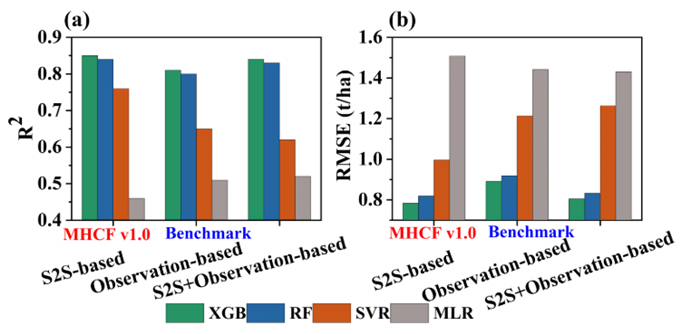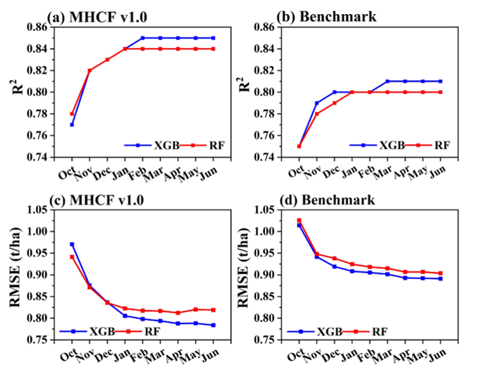 鉴于机器学习和大气动力模型在产量预测上表现出的潜力,华中师范大学曹隽隽博士、王慧静研究生、中科院大气物理所李矜霄博士、中国气象局广州热带所田群博士、美国普渡大学、美国德克萨斯大学奥斯汀分校Dev Niyogi教授等研究人员将次季节-季节动力预测系统 (Li et al., 2021a; Li et al., 2021b) 和机器学习算法进行融合,发展了一套农作物产量预测模型:MHCF v1.0。结果表明:机器学习-动力混合模型在预测中国北方冬小麦 (图1) 产量上相比传统模型(基于观测数据和线性回归)具有明显优势,RMSE减小30%-55% (图2) ,并可以提前于收获季3-4个月达到最佳的预测效果。