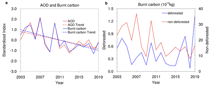 图1 a表示2003–2019年干季(8到10月)SAP区域气溶胶光学厚度(AOD)和山火碳排放的变化;b表示2003–2019年SAP区域森林砍伐区和非砍伐区的山火碳排放。